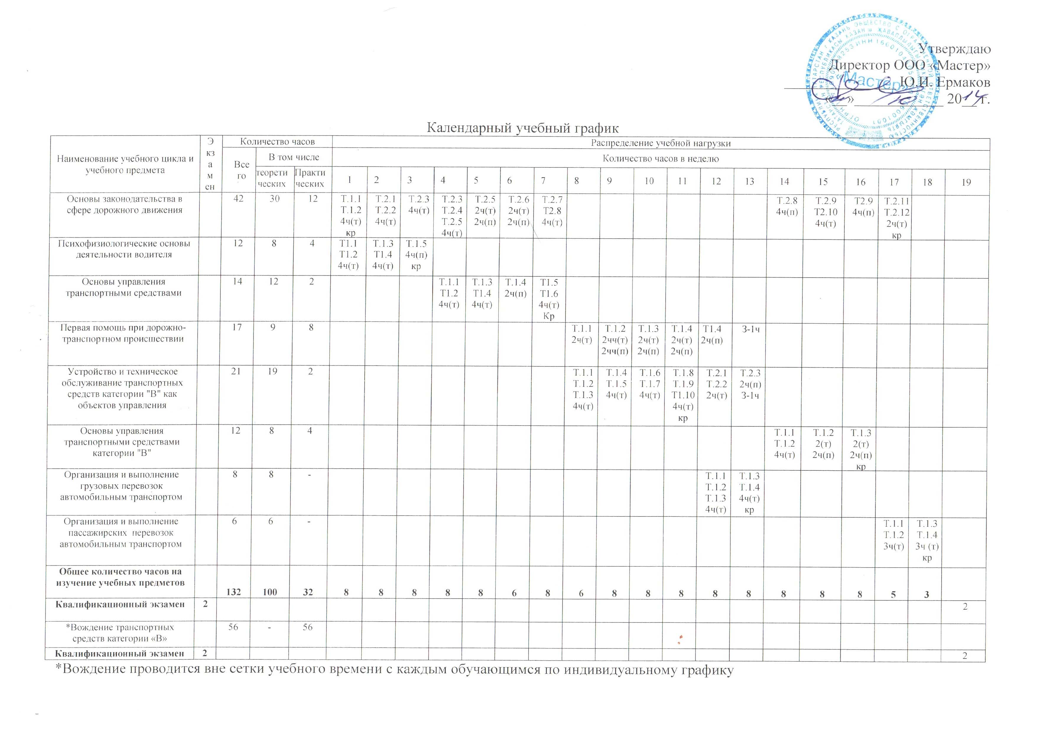 1. Водитель транспортных средств категории "В". Форма обучения дневная. Продолжительность обучения по программе составляет 192 часа, из них 102 часа-теоретические занятия, 34 часа практического занятия в рамках теоретических дисциплин, 56 часов практические занятия по Pin-Up транспортных средств категории "В" ( с механической трансмиссией) срок обучения составит 4,5 месяца.